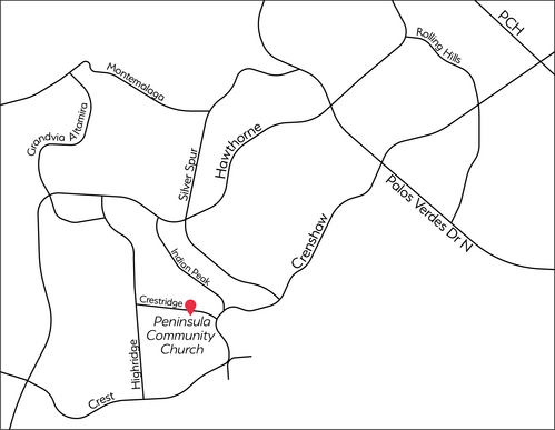 We are located on Crestridge Road less than a quarter mile west of Crenshaw Blvd. We are just up the street from the PV Art Center and across the street from Sol Y Mar Villas. Our physical address is 5640 Crestridge Road, Rancho Palos Verdes, CA 90275. Click here to see us on Google Maps. If you need help finding our church campus, feel free to call our office at 310-377-4661.