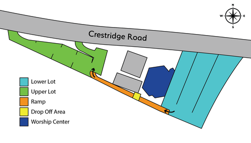 When you arrive on our church campus, feel free to park on either side of the Worship Center. Our east (lower) parking lot generally fills up first. If you have physical limitations and need help getting to our Worship Center, please use our ramp that begins at the east (lower) parking side of the Worship Center. There is a drop-off area that eliminates any stairs.